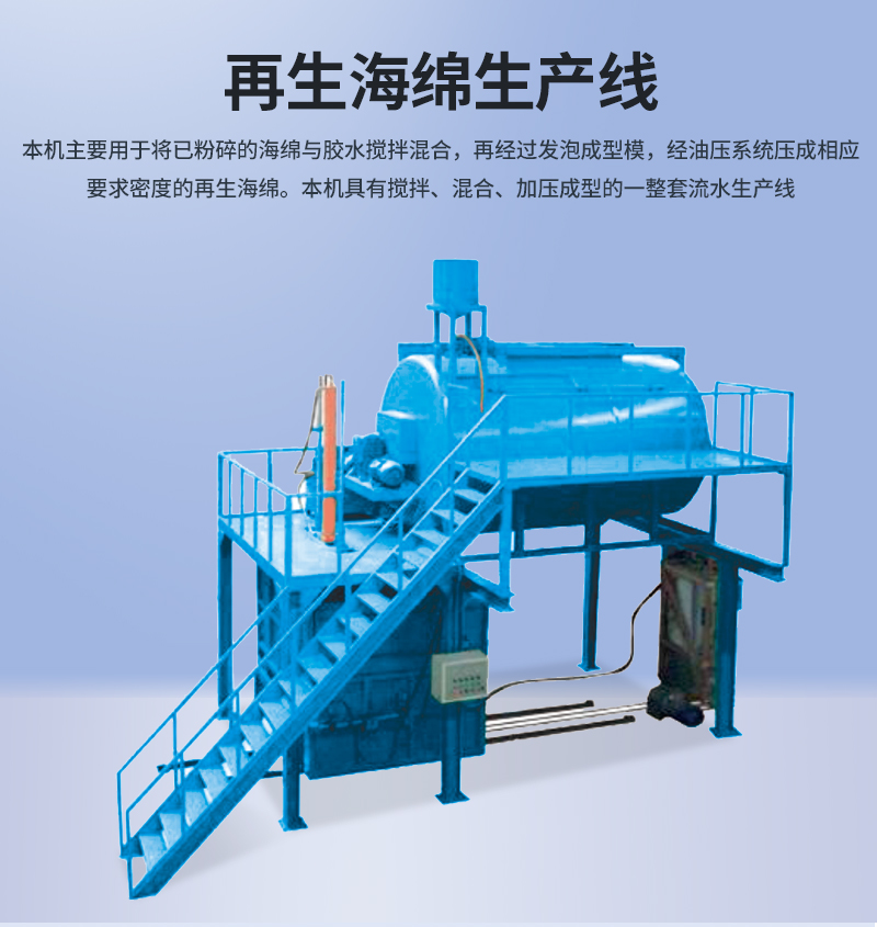 1.本機主要用于將已粉碎的海綿與膠水攪拌混合,再經過發泡成型模具,經油壓系統壓成相應要求密度的再生海綿。