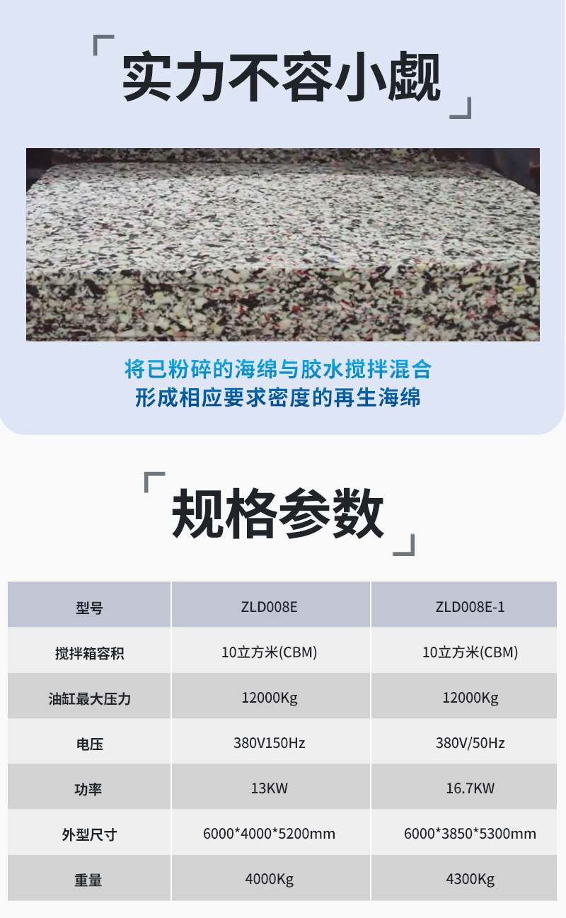 2.本機具有攪拌、混合、加壓成型的一整套流水生產線,生產效率真極高;與碎海綿機組合效果更佳。