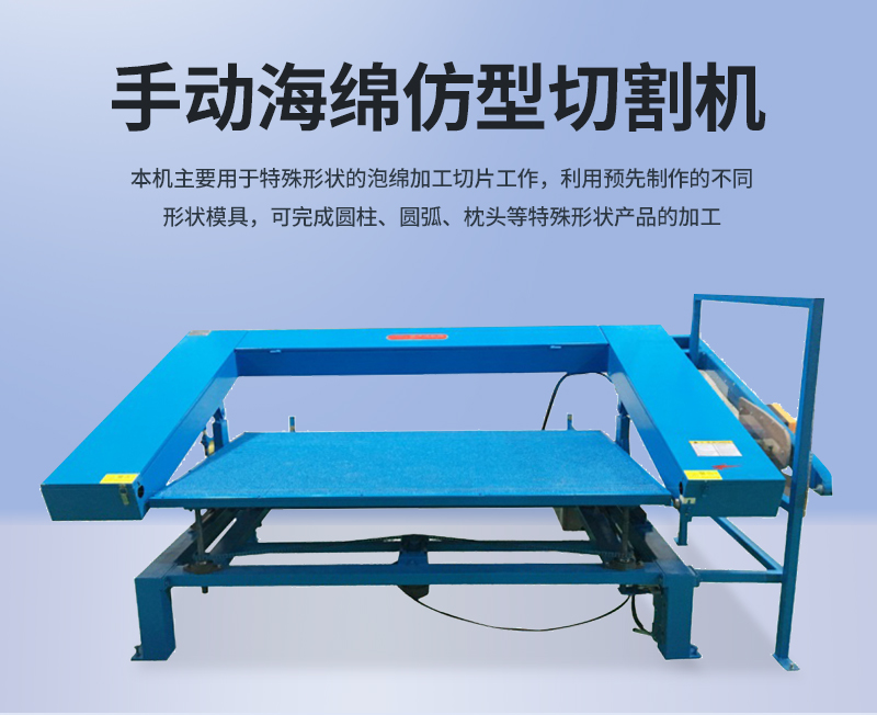 1.本機用于特殊形狀的泡綿加工切片工作,利用預先制作的不同形狀模具,可完成圓柱、圓弧、枕頭等特殊形狀的加工。