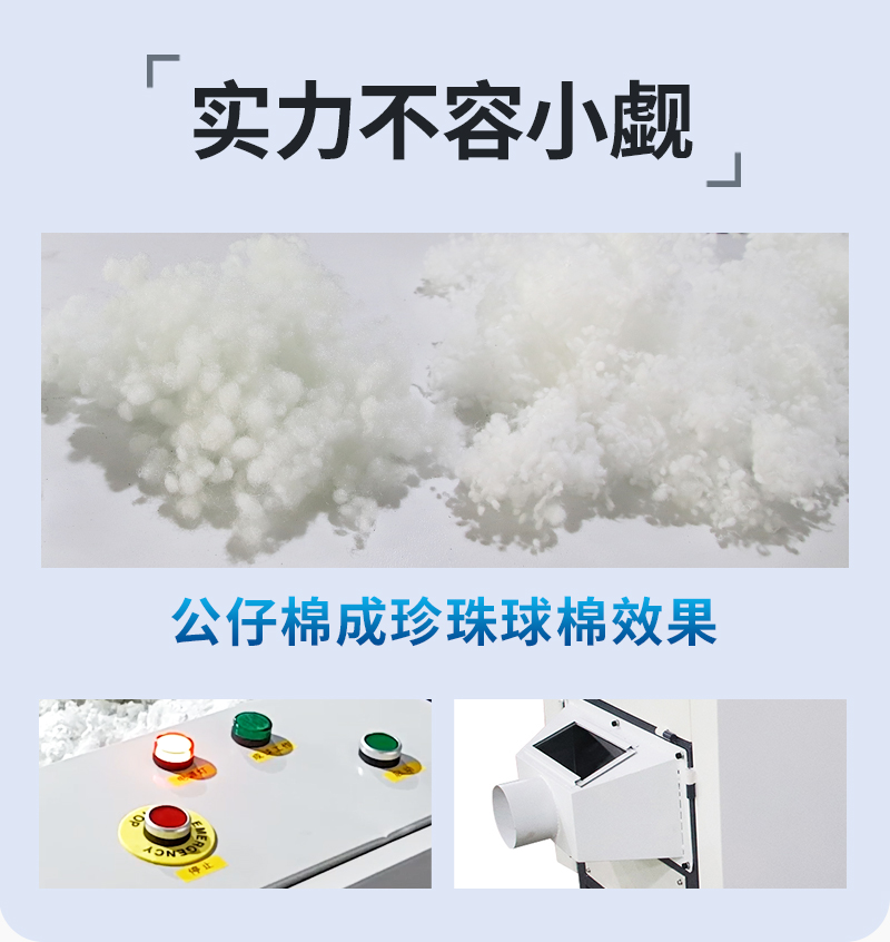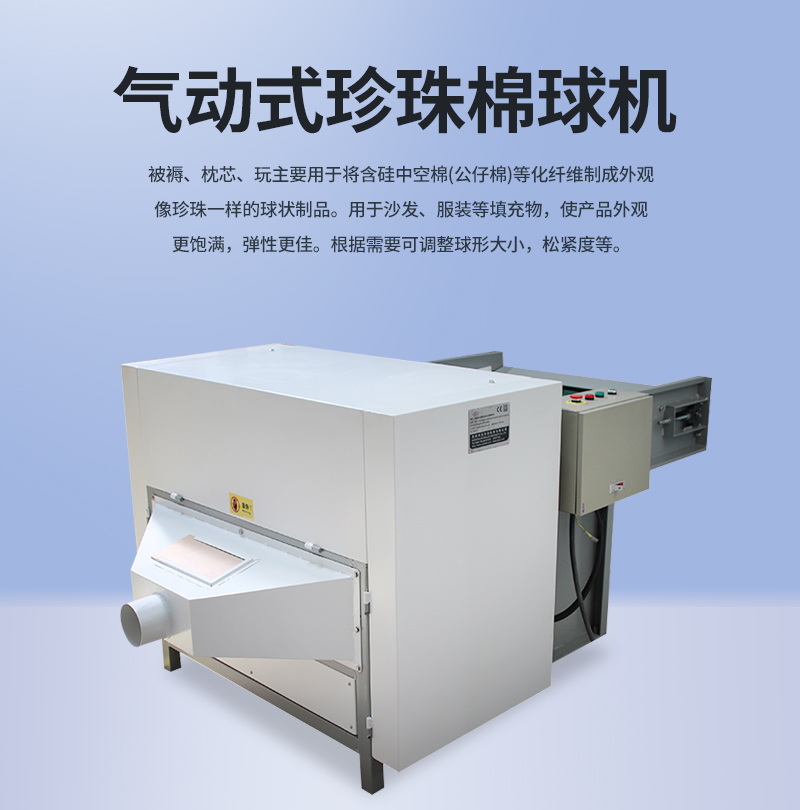 1.氣動(dòng)式珍珠球棉機(jī)主要用于將含硅中空棉(公仔棉)等化纖制成外觀(guān)像珍珠一樣的球狀制品。