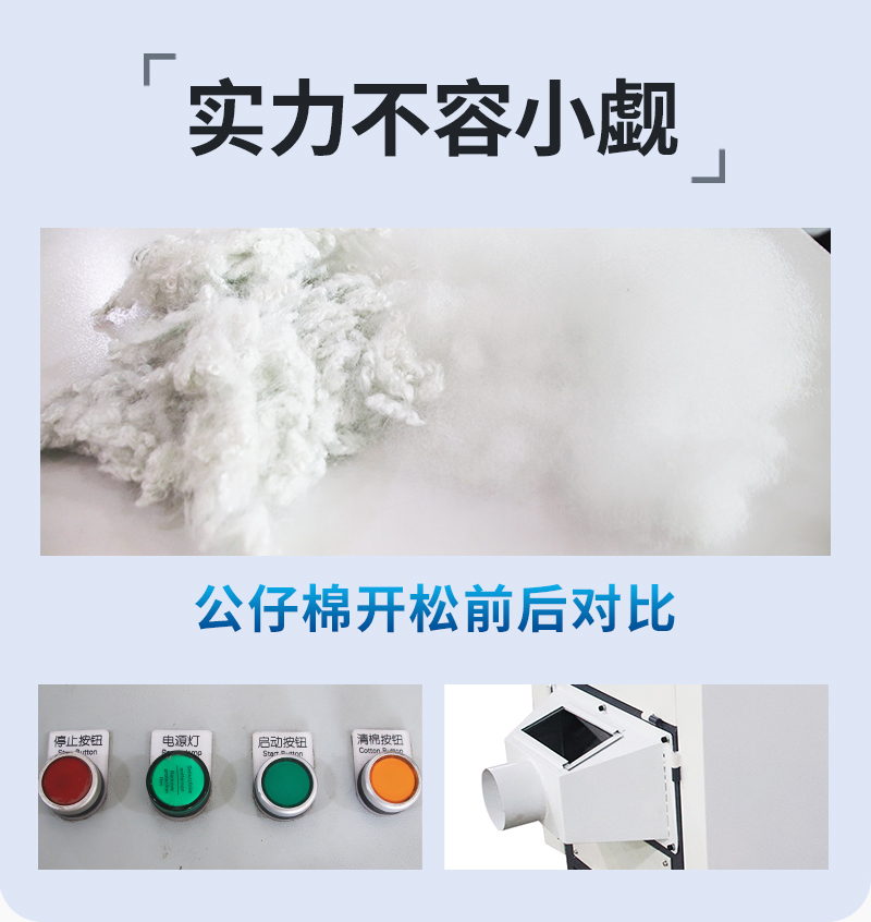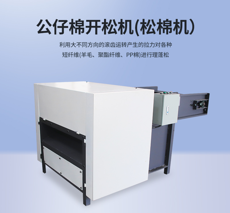 1.公仔棉開松機又名松棉機,整機采用全封閉式,外形整齊美觀大方,自帶保護裝置,操作簡單安全可靠,吊運安裝方便。
