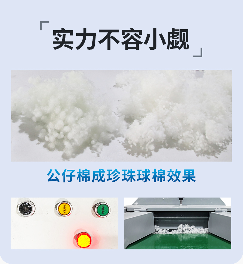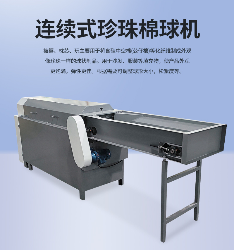1.連續式珍珠球棉機主要用于將含硅中空棉(公仔棉)等化纖制成外觀像珍珠一樣的球狀制品。