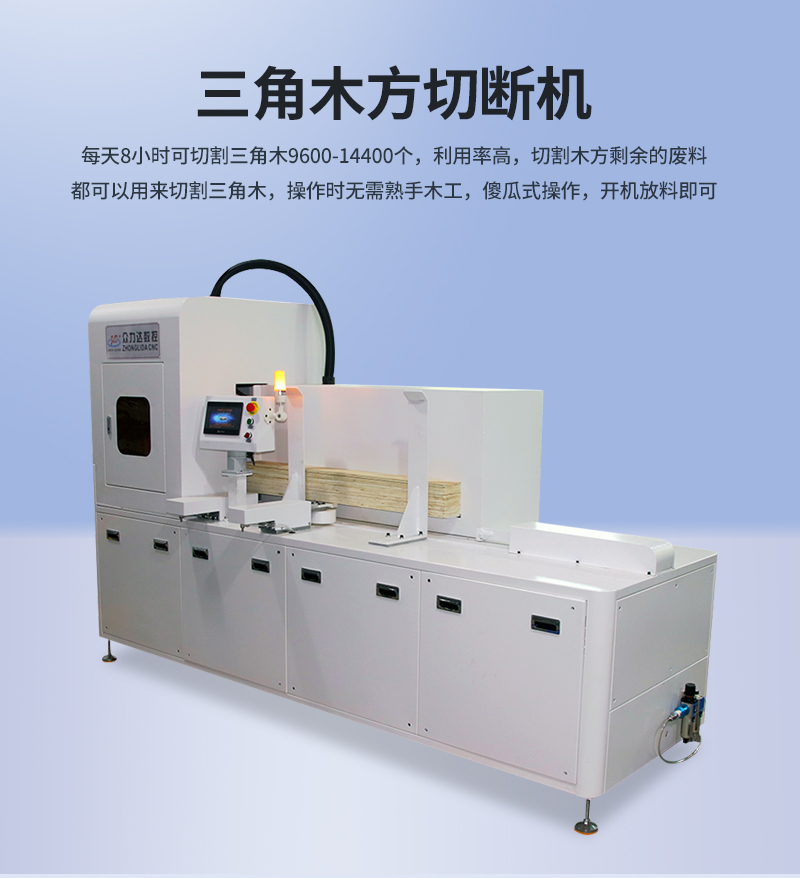 產品介紹: 1.三角木方切斷機,整機采用全封閉式,外形整齊美觀大方,自帶保護裝置,操作簡單安全可靠,吊運安裝方便。
